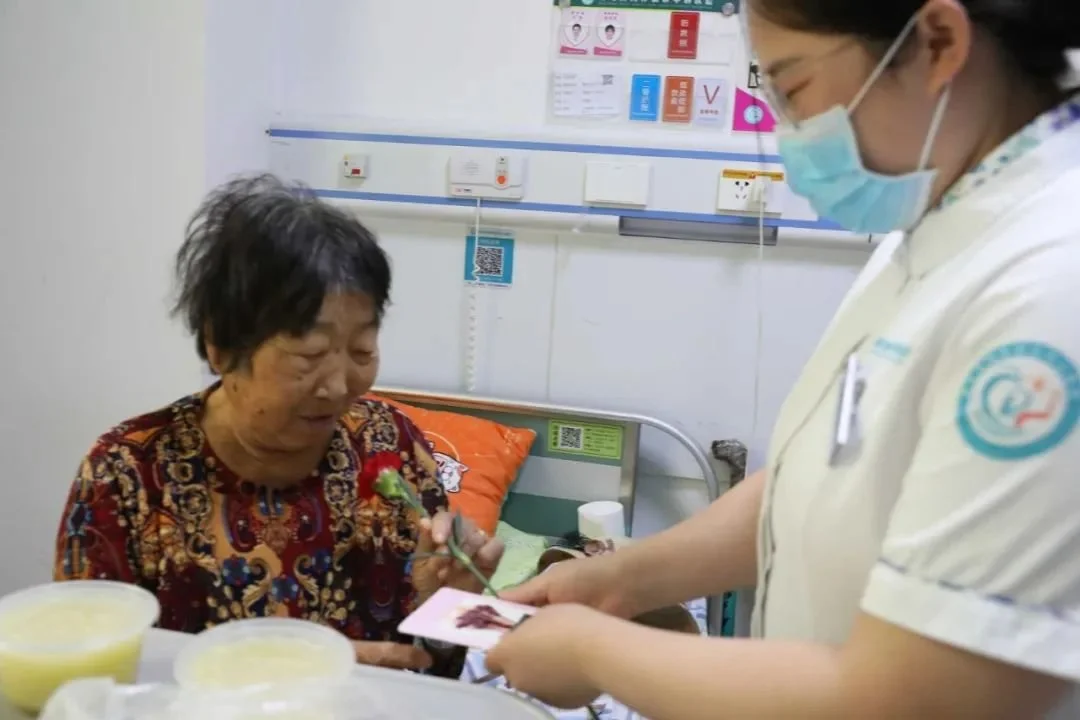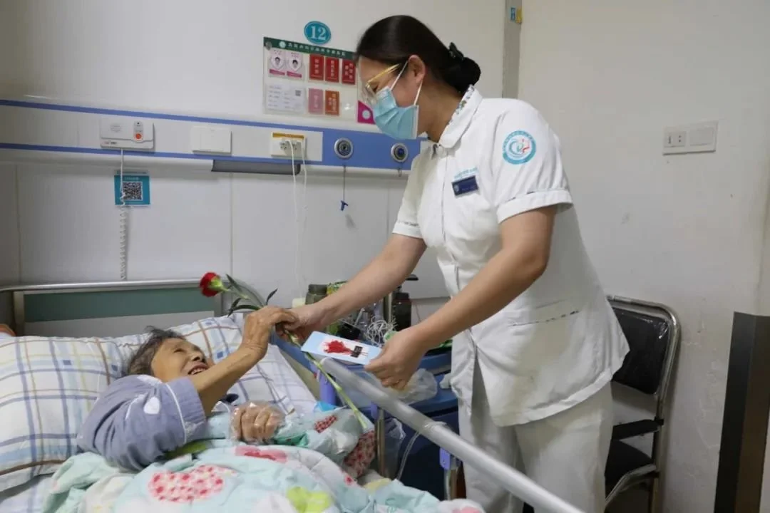 张大爷接过鲜花和贺卡后,不好意思的笑着说:“说来不怕你们笑话,这是我头一次收到送给我自己的鲜花。谢谢你们,感谢党和国家给了我们这样好的生活,感谢中心医院给我的祝福,我真的特别高兴!”王奶奶接到鲜花后,还不忘和护士们开玩笑:“谢谢孩子们!你们也好好上班哈!顺顺利利!”