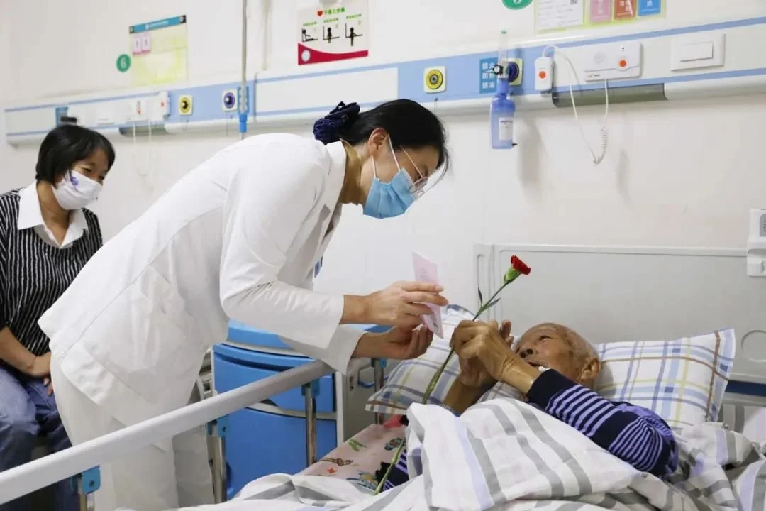 莫道桑榆晚,为霞尚满天。尊老敬老爱老是中华民族的传统美德。在2022年重阳节到来之际,青岛西海岸新区中心医院组织开展“我们的节日·重阳”“九九重阳 温暖健康”新时代文明实践主题活动,医护人员将一枝枝满载真情的康乃馨,一张张写满祝福的贺卡送到老年患者手上,一声声温暖的问候直达患者心头。
