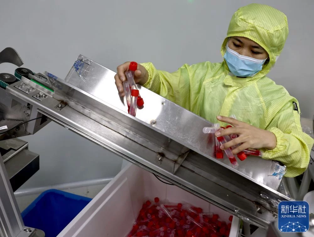 5月1日,工人在上海市金山区枫泾镇上海宝舜医疗器械有限公司核酸试管生产线上工作。该公司通过加装生产线、闭环生产等措施,开足马力生产核酸试管、口罩等防疫物资。