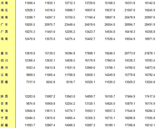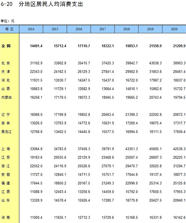 根据官方数据,去年我国农村居民人均消费支出15916元,从全国来看是24100元,城镇居民则为30307元。不过,我国地区间经济发展并不均衡,就如前年,上海地区居民人均消费支出为42536.3元,而山西为15732.7元。