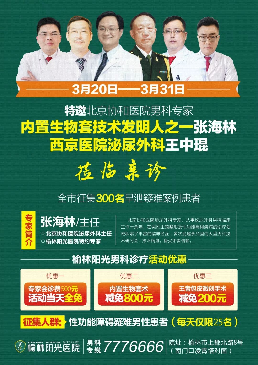 专注男性健康,不断持续引进男科新技术造福榆林百姓,引进的新技术目前已经全部投入到临床使用,为广大榆林男性解决了多年的男科疾病困扰享受幸福生活,医院开设了前列腺专科、不育症专科、性功能障碍专科,同时开展男性微创手术早泄手术,生殖器整形术等男性专科手术。建院至今,医院一直专注于男性疾病的诊断、治疗及疑难病例的研究,是一家集男性疾病研究、预防、保健、治疗、康复于一体的专科医院。