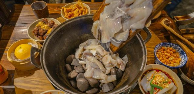 把鱼肉放在300度的鹅卵石上烫滚是种什么体验?没有来到成都之前,我连想都没想过,没有想到竟然真的有这种吃法,不愧是“吃货天堂”成都,致民路上一家名叫鱼夫鱼仔的餐厅里,竟然真的见到了放在300度鹅卵石上的鱼肉,喜欢吃鱼一定不能错过的体验,这也被来自全国各地评为成都最会做鱼的火锅店。