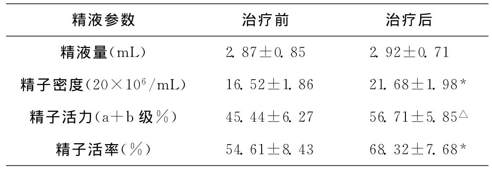 表1 治疗前后精液参数相关指标变化比较(±s)