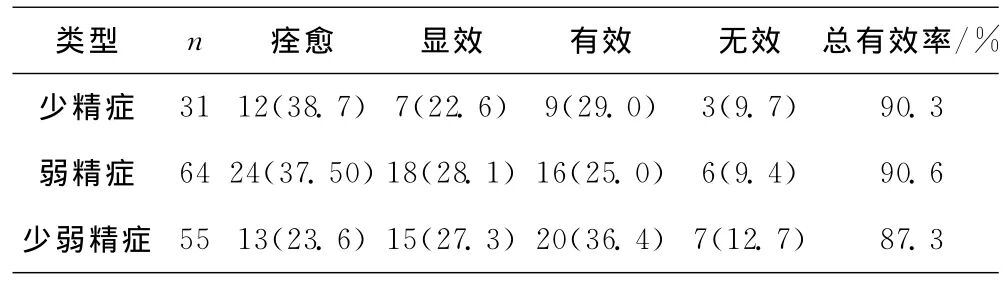 2.2 3种主要精液异常类型总体疗效比较 见表2。