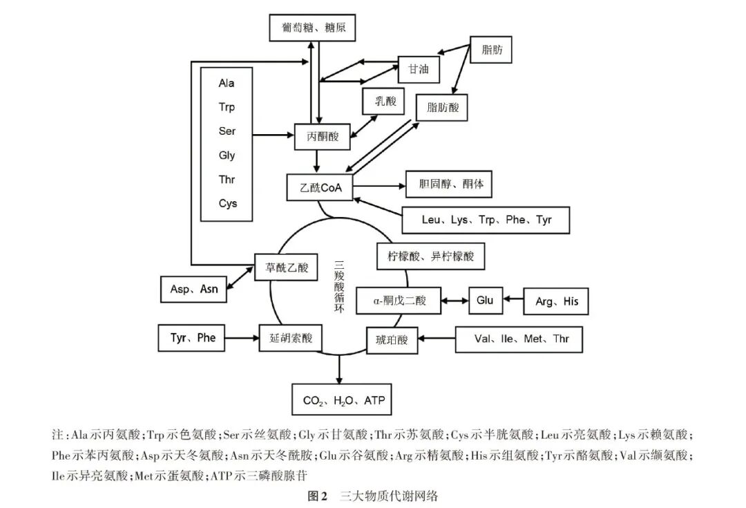 糖、脂质、蛋白质三大物质代谢改变引起的能量供应异常亦是不育症的重要机制,三羧酸循环是三大营养物质的共同代谢通路,是联系三大物质代谢的纽带,多种氨基酸最终均可通过三羧酸循环参与精子能量代谢(图2)。精子的主要能量来源是糖酵解和氧化磷酸化,丙酮酸、乳酸、左旋肉碱等作为糖酵解和氧化磷酸化通路上的重要分子,参与精子发生和精液质量调控。作为ATP产生场所,线粒体的功能状态愈来愈受到关注,线粒体膜电位改变、线粒体介导的细胞凋亡等均与精液质量密切相关[41-42]。生精是维持男性生育能力的关键过程,在此过程中睾丸支持细胞为生殖细胞提供能量和营养支持。丙氨酸、亮氨酸、缬氨酸和谷氨酰胺是支持细胞的重要能量底物[43];乳酸不仅是生精细胞的重要能源底物,同时还可保护生精细胞,减少其凋亡[44]。丙酮酸与乳酸可相互转化,外源性添加丙酮酸可增加精子ATP产生、改善精子活力和运动性[45]。脂质是精子膜的重要组成部分,在生精过程中参与精子结构变化,同时脂质代谢又为精子提供能量。左旋肉碱是精子脂肪酸代谢的必需辅助因子,是脂肪酸进入线粒体内进行β-氧化、产生ATP的载体。据报道,附睾中左旋肉碱浓度比血液中高出近2000倍,附睾上皮细胞具有左旋肉碱主动转运系统[46],左旋肉碱对不育症的治疗效果也已得到研究证实[47-48]。