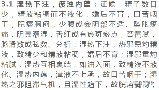 其次,肝肾同源。李其信指出,肝气疏,精血旺者生育强;倘若肝气不舒,肝血失藏,肾精亏虚亦致不育。著名男科专家李海松教授也认为:肝调畅情志,求子心切,所愿不遂,情志抑郁可致肝气郁滞不畅,郁而化火,燔灼阴精,致精稠不化,造成不育。此外,脾主运化水谷,为后天之本,为气血精微生化之源。肾所藏先天之精必得后天水谷滋养,方能生生不息。犹如《景岳全书·论脾胃》所谓:“盖人之始生,本乎精血之源;人之既生,由乎水谷之养......故命门得先天之气,脾胃得后天之气也”,若脾失健运,水谷不化,气血生化乏源,无法充养肾精,肾精失养,则肾精亏虚,造成精子生长发育受阻碍,亦可导致各种不明原因的少、弱、畸形、无精子症,进而影响男性生殖。因此肾虚肾精失藏是导致男性不育症最重要的因素,贯穿男性不育症的始终。同时不可忽视的是,在肾虚为本的前提下,会兼夹出现肝郁、血瘀、湿热等标证。正如国医大师王琦院士指出:“男性不育症发生发展是瘀血、肾虚、湿热三者单独为害或互相作用的结果”“肾虚包括生精功能低下,性事过频等;湿热包括前列腺炎、过量饮酒及其他生殖系统炎症等;瘀包括精索静脉曲张及各种生殖系统慢性病变等”。故李其信认为不明原因性不育症病机首重肾虚,次兼肝郁、脾虚、血瘀、湿热诸证,临证可将男性不明原因性不育症的证型概括为:1)湿热下注,扰动精室;2)肾阳虚衰,肾精不足;3)脾气不足,肾精亏虚;4)血脉瘀阻,筋瘤不育;5)肝气郁结,郁久不育。