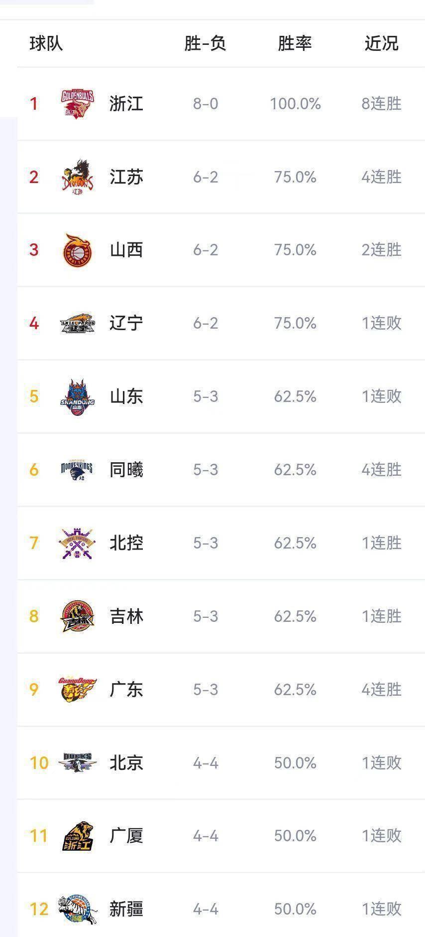 原标题:CBA排名更新!浙江8连胜重回榜首,广东连升7名,江苏两队成惊喜