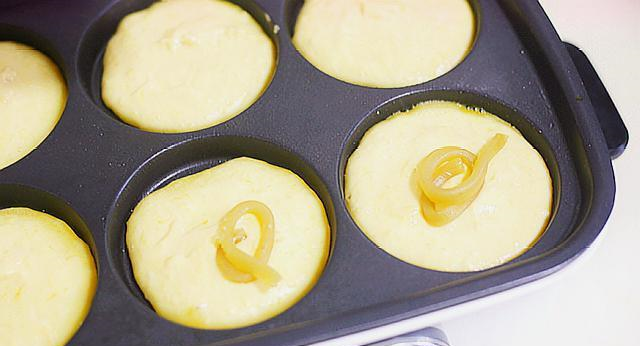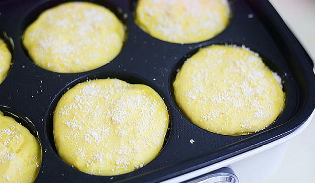 5,在多功能锅的模具中先撒入少许椰蓉,每个模具中先放入一半的南瓜面糊, 然后挤入莲蓉。
