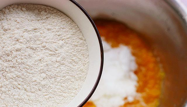 3,首先加入面粉搅拌均匀。
