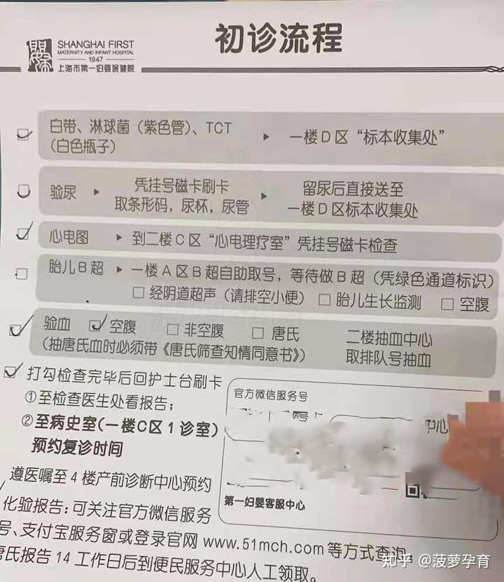 确定怀孕后,孕妈妈就要开始考虑建卡的事情了,那么在上海的孕妈们如何建卡呢?建卡之前做好准备攻略,可以避免不必要的花销。为了帮助孕妈们成功选择中意的医院建卡,菠萝孕育上海站特地整理了上海各大医院建卡攻略及医院产检详情、生产服务环境详情。 今天菠萝姐给大家分享的是上海第一妇婴保健院东院建卡产检攻略,包括建大卡流程、产检项目等干货信息,希望可以帮助大家顺利建卡。 怀孕建卡条件 1、夫妻双方身份证 2、B超胎心胎芽 3、小卡,即上海市孕产妇健康手册 4、孕早期检查单 5、医保卡 6、建卡分为普通门诊、特需门诊和全程门诊。 普通门诊、全程门诊以及特需门诊的区别 1、建卡方面:普通门诊号源多,去了就可以建卡,特需则需要B超见胎心胎芽后去特需门诊提前预约,全程门诊建卡则需要建完普通大卡后,去妇婴保健中心预约全程的医生。 2、医生方面:特需门诊的医生级别比较高,都是副主任级别以上的,且全程医生固定。全程门诊的医生多数是副主任医生,部分主任医师。 3、费用方面:特需门诊每次挂号费是400到600元,根据医生的级别收取费用,且不可用医保卡报销,全程门诊则需要孕妈选择套餐服务。 4、病房选择:特需门诊和全程门诊的孕妈可优先选择医院单间病房。 怀孕建卡所需证件 1、夫妻双方身份证 2、小卡 3、孕早期检查单 4、医保卡 怀孕建卡流程 上海第一妇婴保健院东院建卡,可以分为普通门诊建卡、特需门诊建卡及全程门诊建卡。 普通门诊建卡流程 1、挂产科门诊号,到医院1楼C区产科初诊护士台告知建卡。 2、提前到当地社区医院办理小卡。 3、看医生,开检查单,包含:空腹抽血、B超、尿检、白带检查等。 4、全部检查结果出来,看医生,预约12周的NT B超,办理建卡即可。 全程门诊建卡流程 1、孕6~8周挂早孕科B超检查有胎心胎芽 2、普通产科建卡(建卡直通车科室) 3、母婴中心预约全程 4、普通产科做NT 5、NT结果出来再去母婴中心正式交费选医生,以后就都是全程医生看了。 特需门诊建卡流程 1、孕6到7周做B超检查,出来胎心胎芽后,即可到医院4楼特需门诊服务台。 2、选择医生,预约特需门诊。 3、到当地社区医院办理小卡 4、孕12周,看医生,开具检查单,做抽血、验尿、心电图检查、NT B超等。 5、全部检查结果出来,看医生,办理建卡。 特需攻略 1、特需医生都是副主任医生和主任医生,门诊费分别是400元和600元。 2、特需门诊建卡时间比较紧张,B超出来胎心胎芽后,可提前去特需门诊预约。 关于建卡挂号 普通门诊 1、第一妇婴客服中心gzh,点击菜单“在线服务”—选择产科建卡即可。 2、医院现场挂产科门诊。 3、上海市第一妇婴保健院gzh,点击菜单“建卡预约”即可。 4、支付宝生活号上搜索上海市第一妇婴保健院,选择预约挂号即可。 全程门诊 普通建大卡后,直接到母婴保健中心预约即可。 特需门诊 B超出来胎心胎芽后,直接到四楼特需门诊预约即可。 孕期产检攻略 产检分为普通产检、特需产检、全程产检,其中特需产检和全程产检都是固定一个医生,特需在4楼,全程在1楼。 NT B超 孕11到13周做NT检查即可,一般可建卡完成后预约NT。 唐筛 1、时间:孕15到20周抽外周血,无需空腹。 2、费用:220元左右。 无创DNA 1、时间:孕12到26周,最佳时间为孕12到22周。 2、费用:基础版1250元;全因版3600元。 3、取结果:基础版需要10个工作日到门诊1楼“便民服务中心”领取纸质报告;全因版需要7到10个工作日出结果,手机会收到短信通知,到时候直接到门诊4楼“无创DNA服务台”领取纸质报告。 大排畸 1、时间:孕22周到24周,二维,不能做四维,支持非本院建卡孕妇做。 2、费用:420元左右。 糖耐量时间 孕24到28周,早上9点之前到医院空腹抽血。 糖耐量流程 1、检查前一晚,禁食禁水8到14小时。 2、早上9:00前到医院抽空腹血,自带大于300ml刻度的水杯。 3、抽空腹血,领取糖耐量筛查小白卡。 4、从喝糖水的第一口开始计时,5分钟内喝完。 5、分别于1小时、2小时后测血糖。 关于无痛导乐 1、有无痛,身体允许且麻醉师有时间可以打,开两指可用,费用2600元。 2、顺产、有单人间产房时可请导乐,费用1000左右,同时可以有一位家属陪产。 医院病房环境 1、特需病房:特需病房有标准单人间和套房,在10楼及11楼,分别有A、B两个病区和南北两个朝向。房间价格根据朝向不同,分为3200/晚及4200/晚,需要全部自费。 2、普通病房:分为2人间和3人间,2人间费用为1200元左右,3人间75元/晚。 3、产后陪护:特需病房允许一个家属陪床,可以请医院护工,300元/天,一对一;一对二,每天210元左右。 4、待产室:家属不能陪待产,可以请护工,20元/小时。 5、待产包:医院提供待产包,可自行准备,比如胎监带、孕妇洗漱用品、生活用品、婴儿纸尿裤、产褥垫等。 特需病房详细介绍 入院待产包 产房待产包 手术准备用物以及注意事项