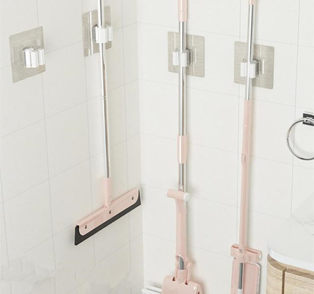 门口的空间虽小,但可利用的墙面也不小。装不下吊柜、毛巾杆,可以贴上免钉挂钩,挂上拖把、玻璃刮水器等扁平状的工具;亦或者是装拖把夹,稳固不晃动,存取也方便。