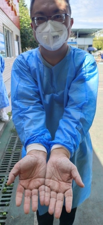 实验室高强度的工作下,每个检测人员出来都是汗流浃背的,整个人像从水里捞出来一样;检测人员由于长期单手拧盖,被磨出了茧子,再变成硬茧;还有原本没有高血压的检测人员出现了高压158的情况……即便如此艰难,所有支援核检测的人员都克服了过来,并告诉医院不要为他们担心,他们定会保护自己,不辱使命,平安归来!