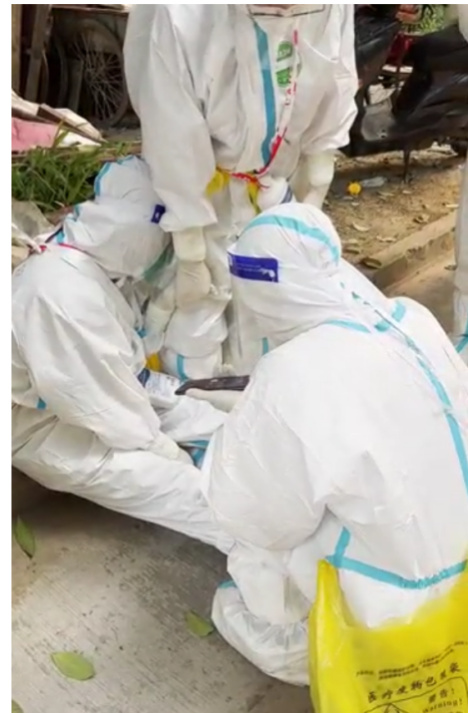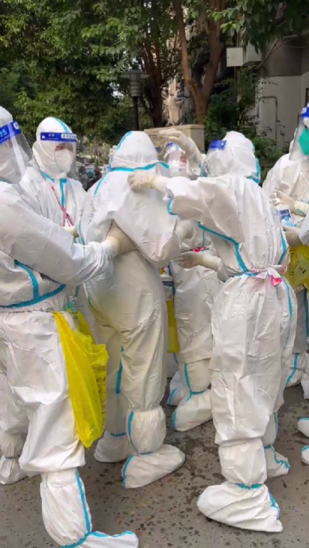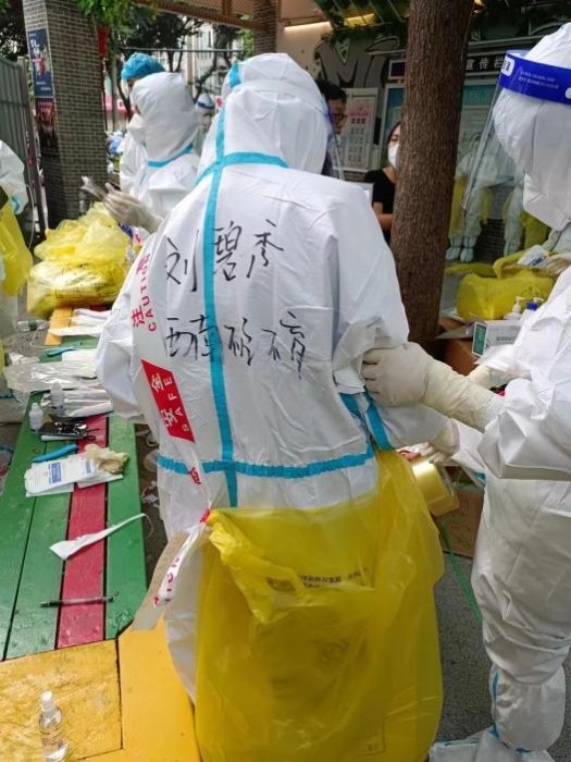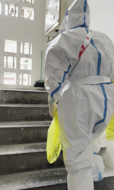 在支援核酸采样队伍中,有人去过10多批次,有人因连日劳累晕倒在采样路上。已经连续上了战疫一线6天的秦攀虹说:“最辛苦的是去老小区上门采集核酸,需要爬楼梯一层层上去,穿着厚厚的防护服有点缺氧的感觉,很难受,当爬上六楼的时候人都感觉是晕的。但每当听到他们说一句‘谢谢’,就像给我们加油一样,让我们能继续爬!”