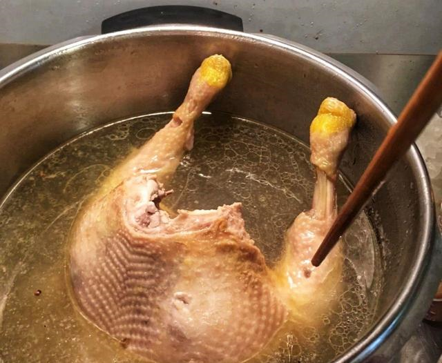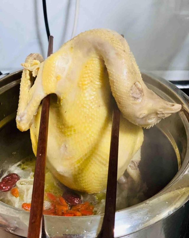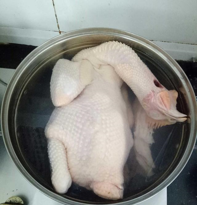 4、起锅烧水,锅中加适量水,水位以没过鸡为宜,然后加入葱姜,再加适量的盐和胡椒粉,大火猛烧,直至烧开。烧开以后把三黄鸡放入锅中,转小火煮10分钟,然后就可以关火了,关火以后,不要捞出,盖上锅盖,让鸡在开水中泡20分钟,这是为了断生。