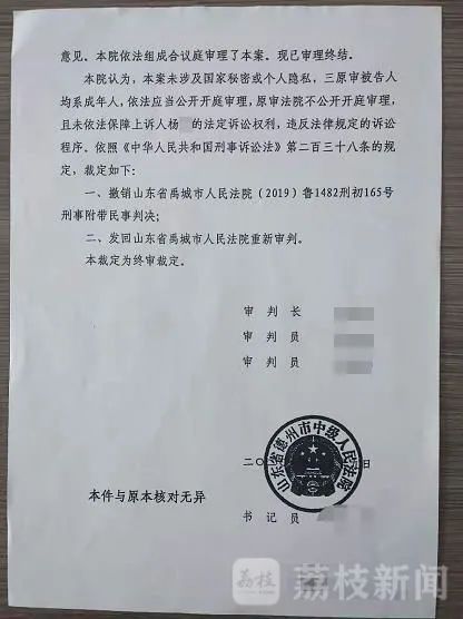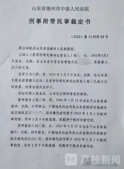 图片来自荔枝新闻该案一审审理期间,程序上出现诸多问题。律师提供的《山东省德州市中级人民法院刑事附带民事裁定书》显示,该院认为,本案未涉及国家秘密或个人隐私,三原审被告人均系成年人,依法应当公开开庭审理,原一审法院不公开开庭审理,且未依法保障上诉人杨某的法定诉讼权利,违反法律规定的诉讼程序。德州中院据此撤销山东省禹城市人民法院(2019)鲁1482刑初165号刑事附带民事判决;发回山东省禹城市人民法院重新审判。该裁定书落款日期为2020年4月29日。死者生前曾遭打、冻、饿和禁闭谢树雷称,方某洋与丈夫张某两人由媒人介绍相识,2016年农历11月18日两人结婚,2018年秋天开始,丈夫张某开始打方某洋。