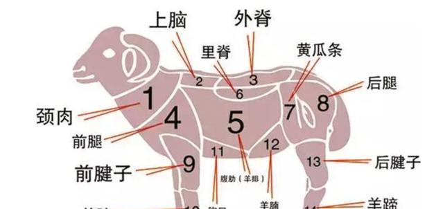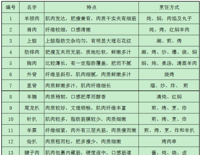 我之前也很迷茫,后来认识了一位屠夫。他给我详细说了一下,下面我分享给大家。首先把老屠夫给我说的内容,做了一个表格,把一只羊身上的肉,大概分为14块;每一块的位置以及特点,还有对应的烹饪方式,都列了出来。有兴趣的话,可以收藏下。