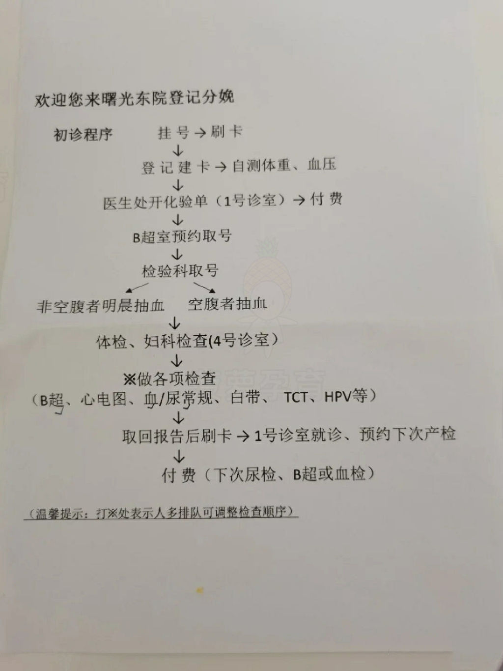 3、挂号缴费,B超室预约取号(排队时间比较久),抽血(空腹!)、尿检,监听胎心等检查。