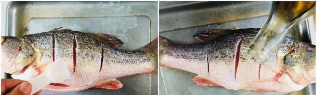 【制作食材】鲈鱼、姜、葱、火腿【制作步骤】第一步:刚从菜市场买回来的活鱼,已经让老板给处理过了,回来清洗干净以后,我们先在鱼的身上划开三刀,这样再腌制的时候就会更加入味好吃,鱼两面都像下图这样,都划开。
