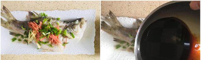 第四步:蒸好以后盘中会有多余的水份,把水份全部倒掉,再鱼的表面撒上葱丝,火腿丝,淋上热油,然后再倒上蒸豆豉汁就可以了。如果家里有没呢蒸豆豉油,也可以自己调,一个干净的碗中,两小汤勺耗油,一勺生抽,小半勺白糖,加点凉白开化的稍稀一点,直接淋在鱼身上就可以开吃了。