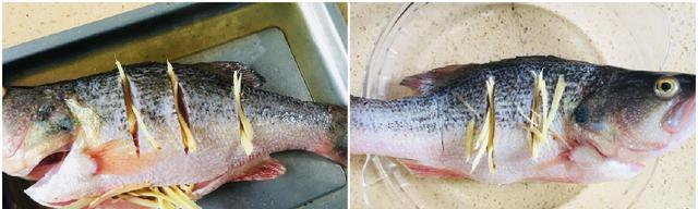 第三步:再鱼切开的刀口位置,和鱼肚子里,都塞上姜丝和葱白丝。然后腌制20分钟。20分钟以后就可以上锅蒸了,水开后大火蒸12分钟,出锅。