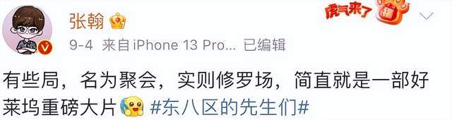 更要命的是,最近由张翰出品、制作、编剧、主演的《东八区的先生们》播出了,这部剧里通篇的男性凝视和满嘴的胡说八道,让人非常yue。