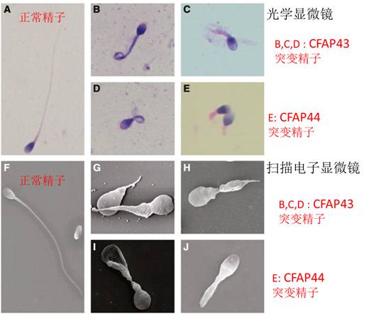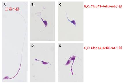 显微镜图展示突变引发的精子鞭毛形态异常。