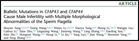 中文题目:CFAP43 和 CFAP44基因的双等位基因突变是导致人类精子鞭毛多发形态异常进而引发男性不育的重要原因