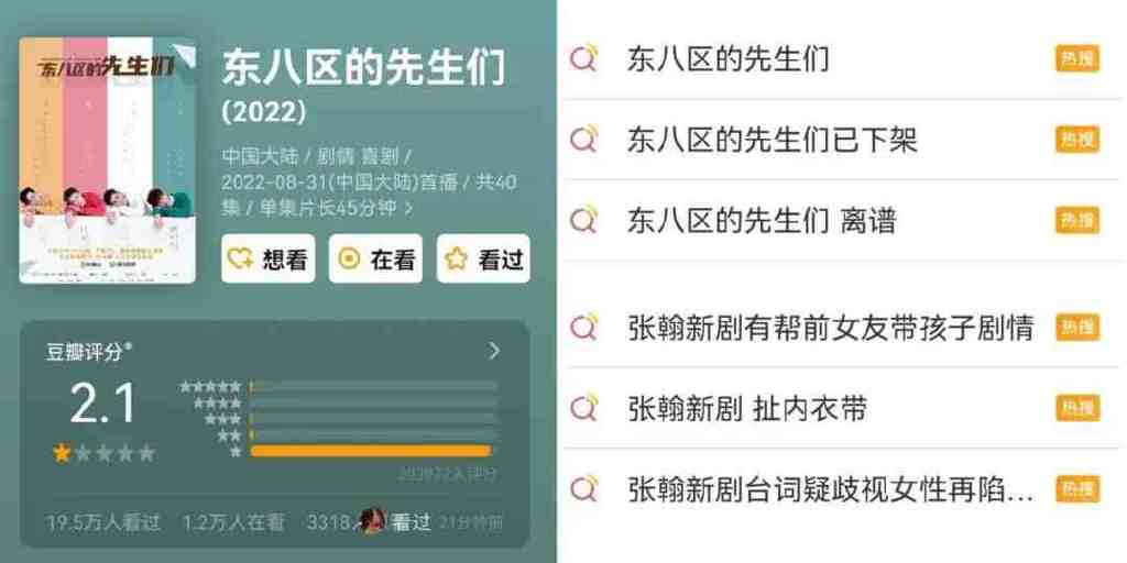 然而这部剧的高关注度,却并非出自人们的夸赞和安利,而是铺天盖地的争议与质疑。#东八区的先生们 油腻##张翰新剧 扯内衣带##张翰新剧台词疑歧视女性再陷争议#等话题接连登上微博热搜,豆瓣评分更是降至2.1,完美“击败”人们吐槽多年的《逐梦演艺圈》,现在更是直接落得个下架的凄惨结局。